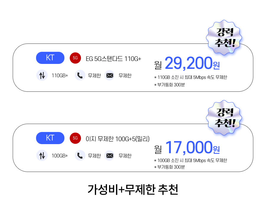 | EG 무제한 일5G+5 | 일5GB+ | 기본제공 | 기본제공 | 월 45,100원 월 17,000원 7개월이후 평생 45,100원 |