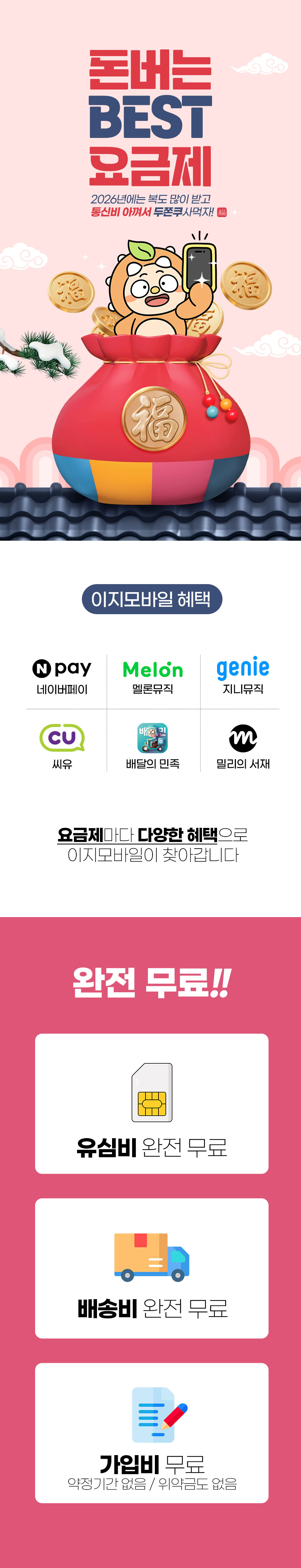 | EG 무제한 15GB+1(밀리의 서재) | 15GB+추가 데이터 10GB 무료제공[24개월간] | 기본제공 | 기본제공 | 월 25,850원 월 13,000원 7개월이후 평생 25,850원 |